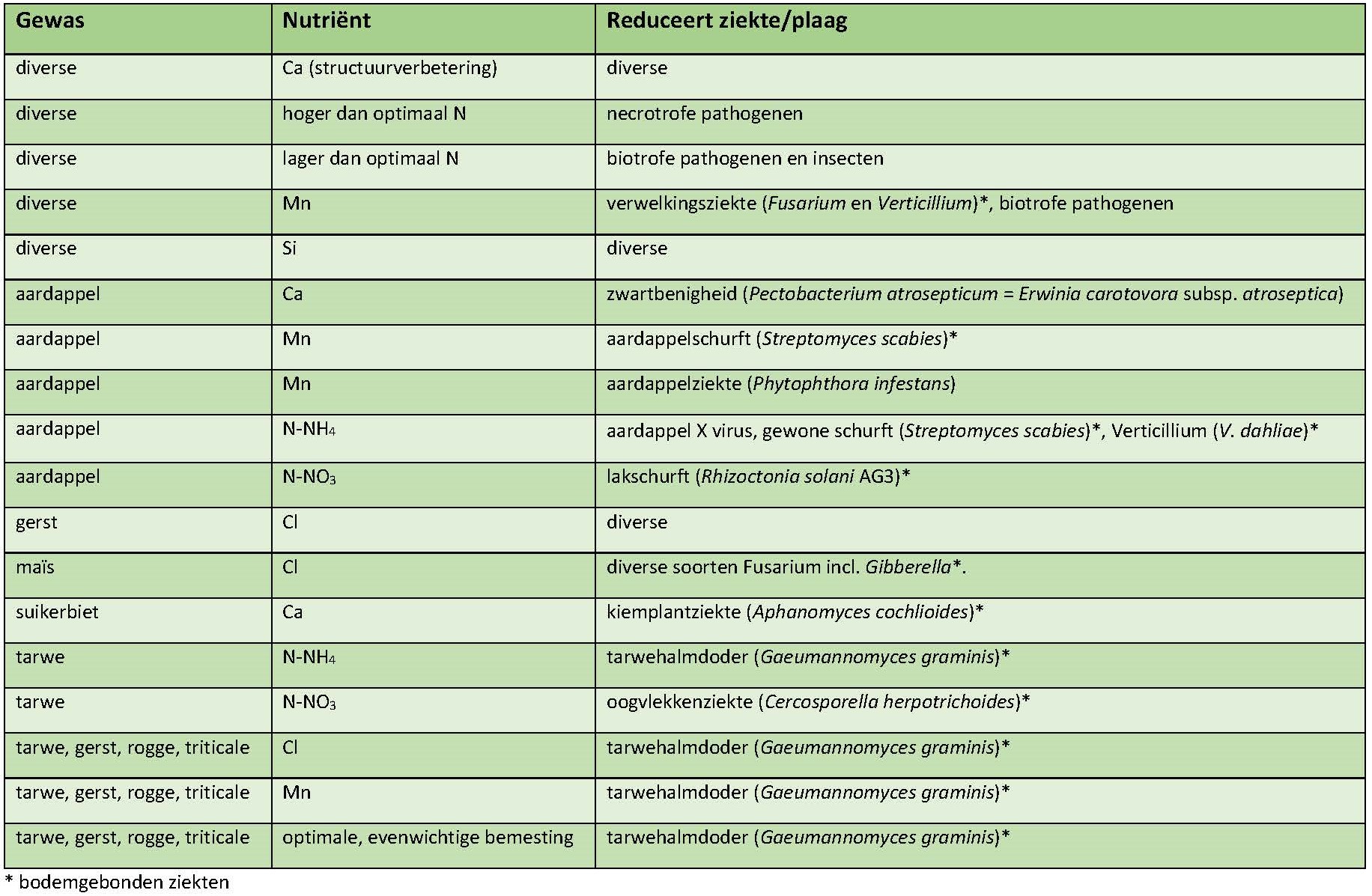 Tabel 1. Effect van nutriënten op het reduceren van ziekten en plagen bij een aantal grote akkerbouwgewassen op basis van wetenschappelijke literatuur